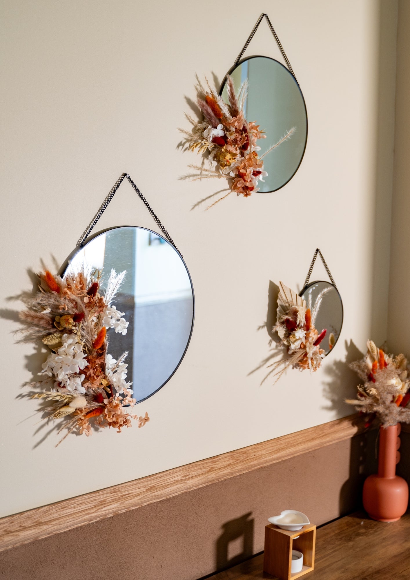 Transformez votre intérieur avec l'élégance intemporelle des miroirs fleuris. Chaque miroir est soigneusement orné de délicates compositions de fleurs séchées, sélectionnées et assemblées à la main pour créer une pièce unique et raffinée. Que vous souhaitiez ajouter une touche de charme à votre salon, votre chambre ou même à une salle de bain, nos miroirs fleuris apportent une beauté naturelle et un éclat subtil à n'importe quel espace.