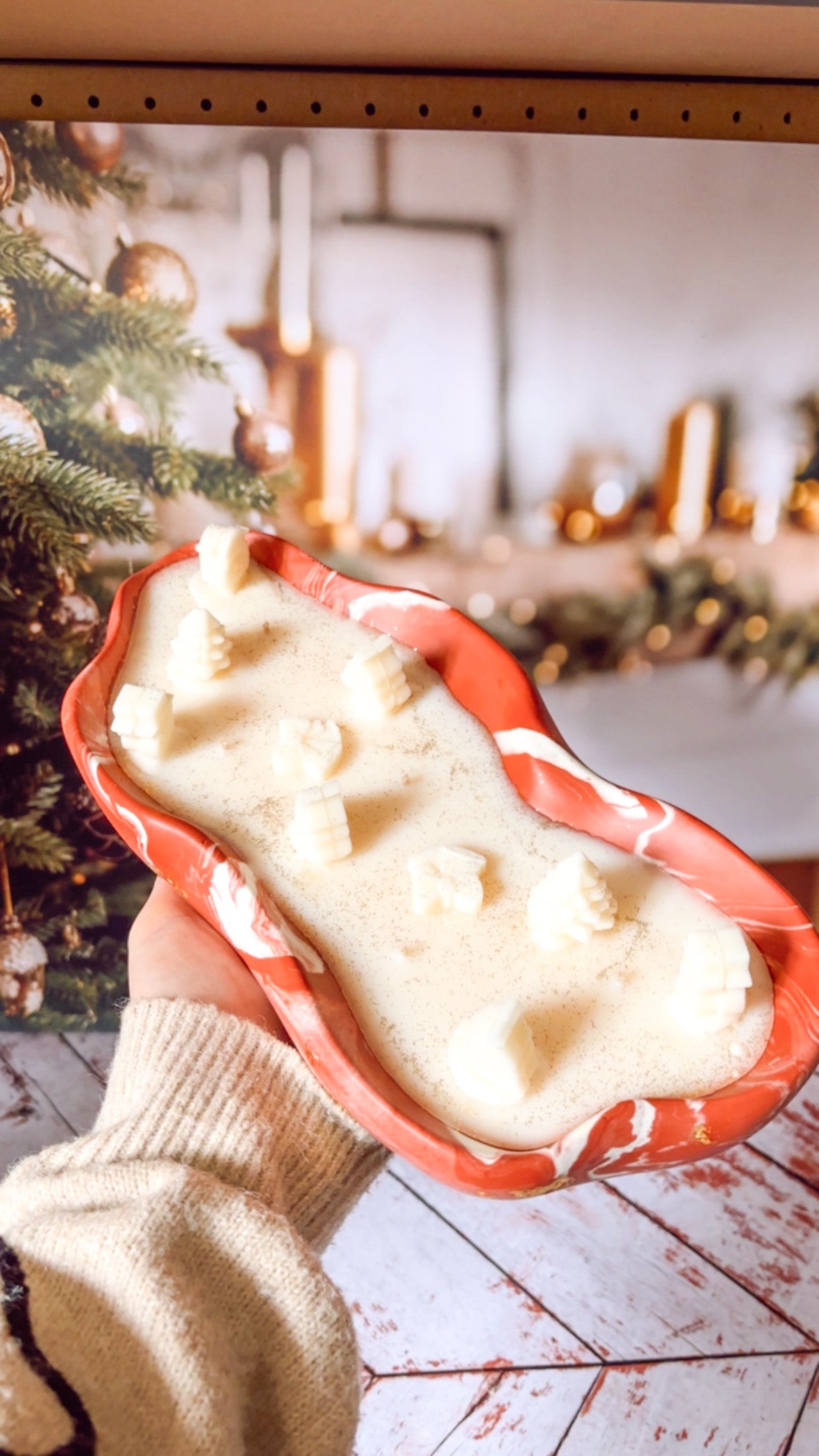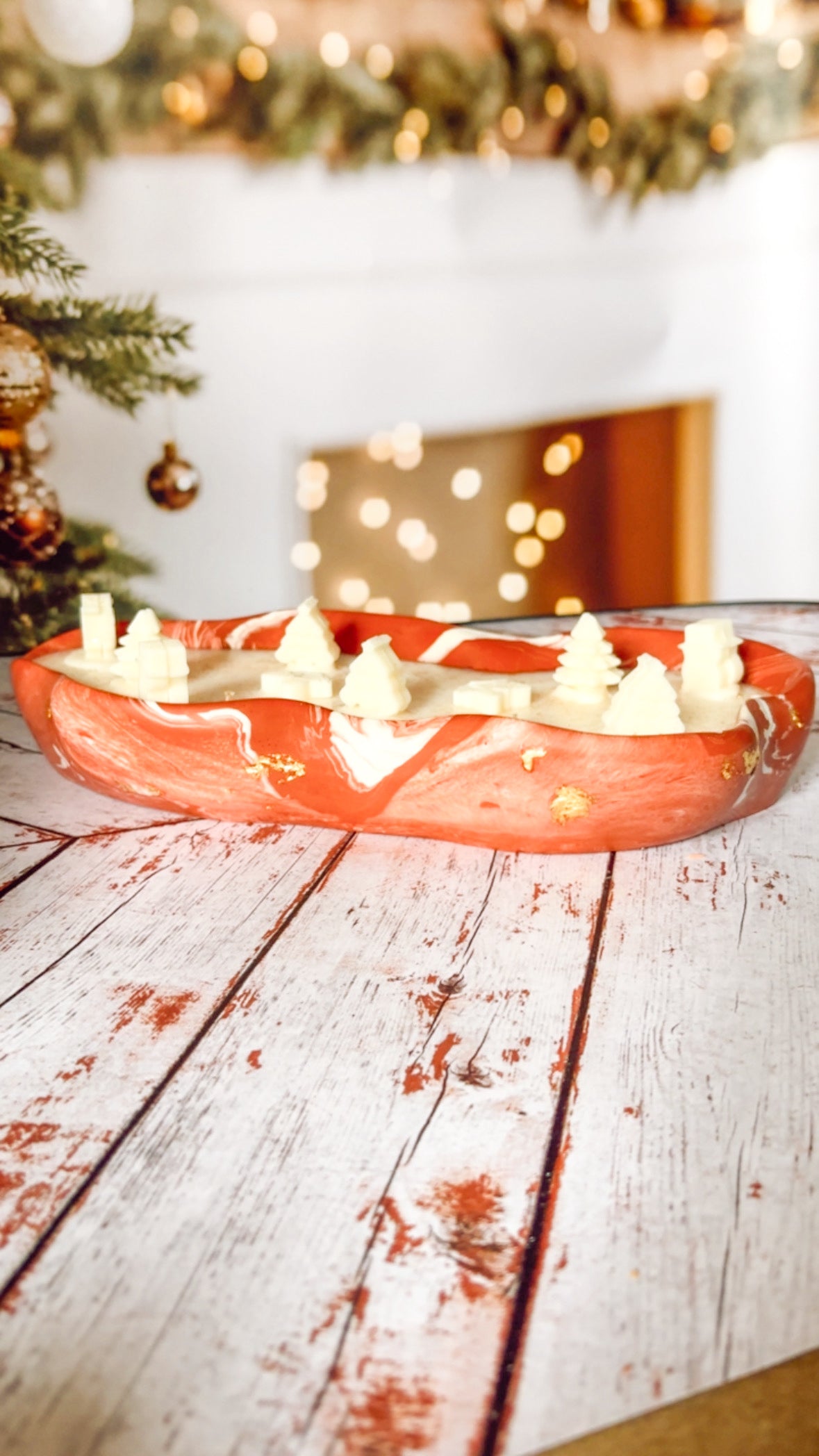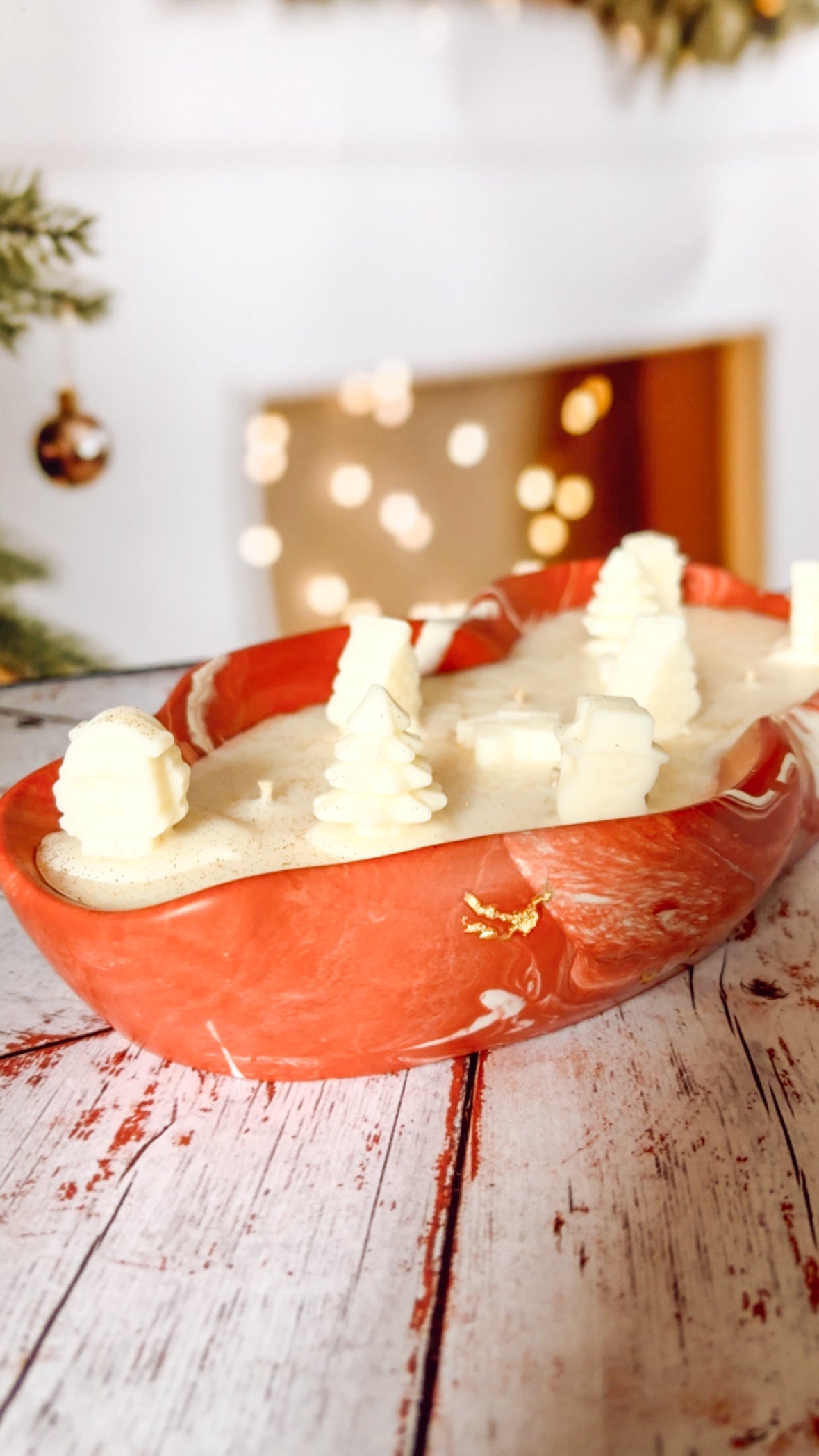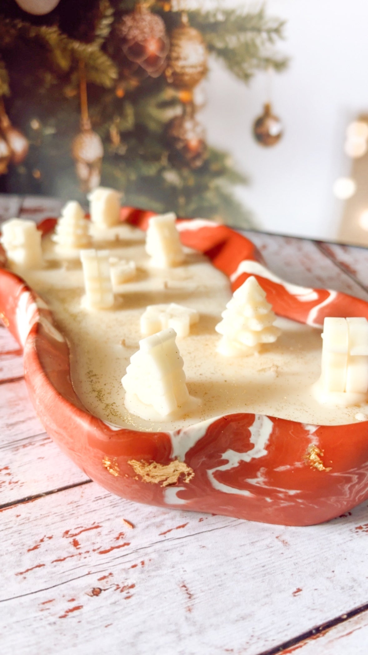 Une magnifique bougie avec un contenant fait à la main en jesmonite dans les tons rouges.
