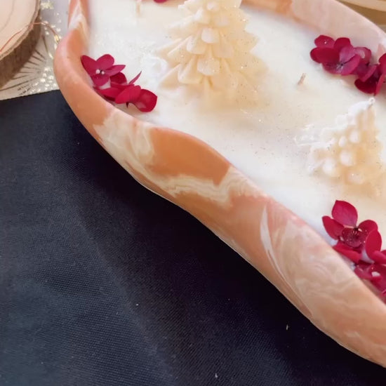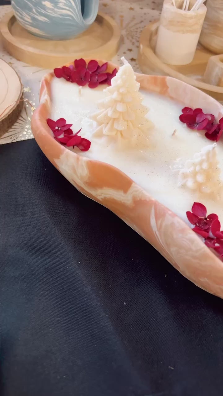 Une magnifique bougie avec un contenant fait à la main en jesmonite dans les tons terracotta clairs