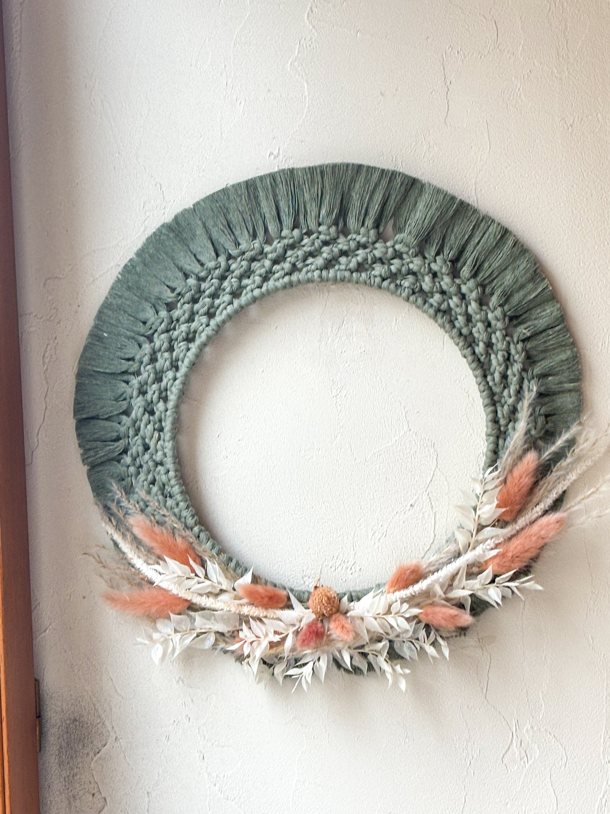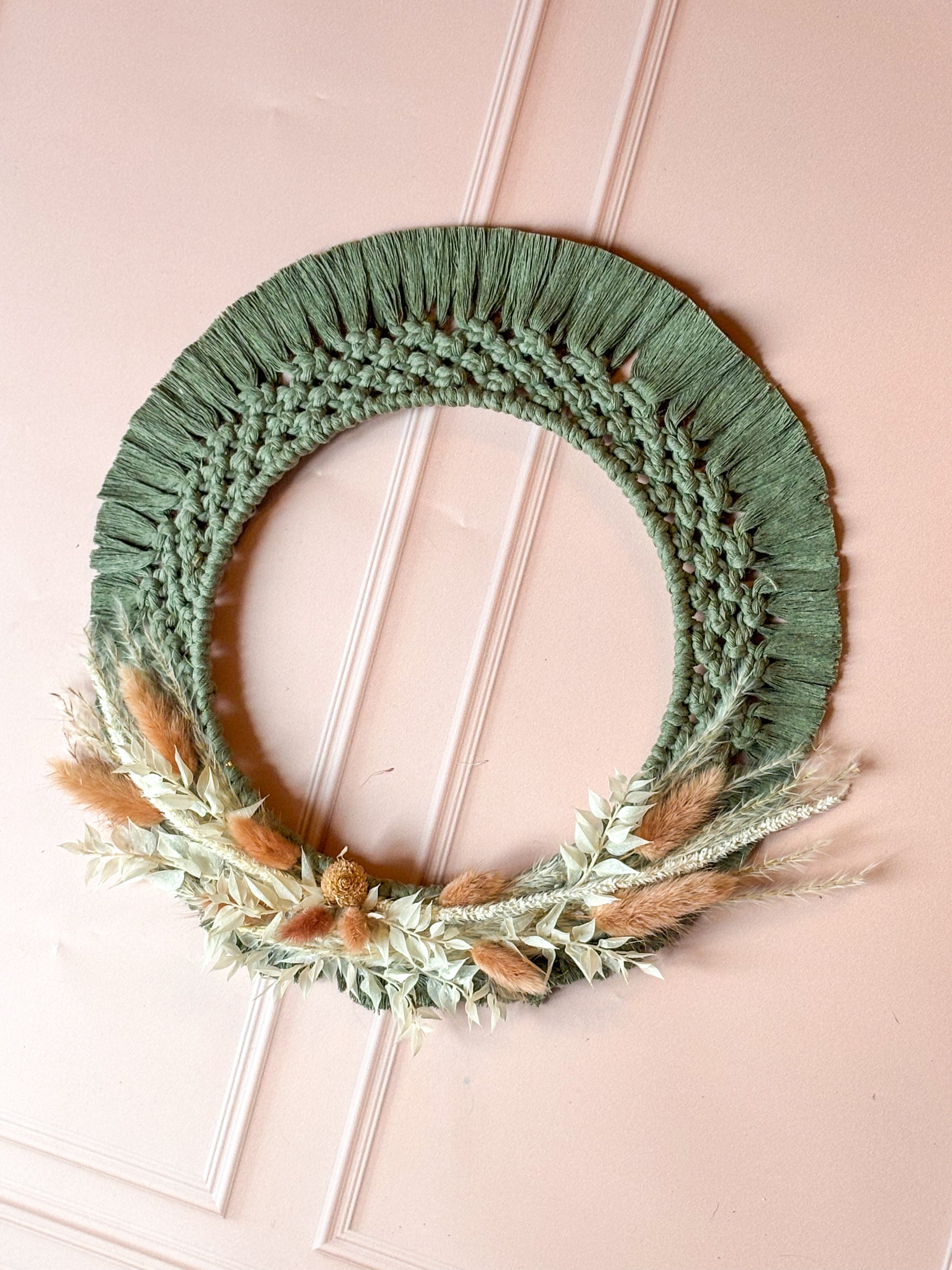 Sublimez votre intérieur avec une décoration murale, alliant l’élégance du macramé à la beauté naturelle des fleurs séchées. Cette pièce artisanale unique associe la douceur des fibres tressées à la délicatesse des fleurs, créant une œuvre d’art à suspendre qui apportera chaleur et charme à n’importe quel espace. Parfaite pour une chambre, un salon ou une entrée, cette décoration est un véritable hommage à la nature et à l'artisanat.