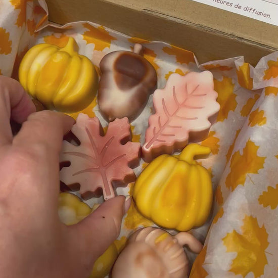 Fondants vendus par lot de 9 un assortiment de 9 fragrances automnales sont proposés dans ce coffret :